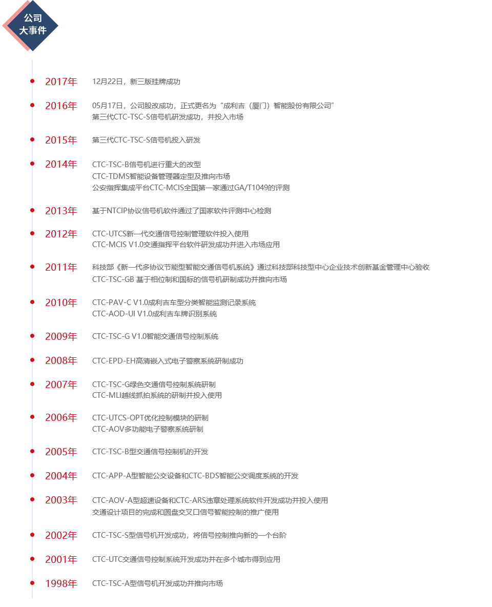 成利吉(廈門)智能股份有限公司,成立于1998年,是國內(nèi)最早從事智能交通領域產(chǎn)品研發(fā)和應用、專業(yè)智能交通核心軟件開發(fā)、智能交通系統(tǒng)集成與運營服務的企業(yè)之一。公司于2016年5月正式更名為成利吉(廈門)智能股份有限公司,并于2017年12月22日新三版成功掛牌。